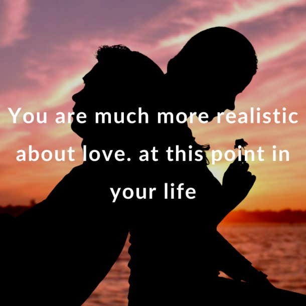 Vous êtes beaucoup plus réaliste en matière d’amour à ce stade de votre vie et vous avez sérieusement tiré les leçons de vos relations passées. Vous n’êtes pas là pour répéter les mêmes erreurs.
